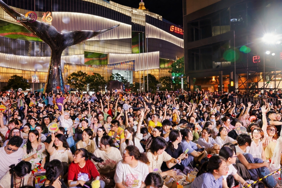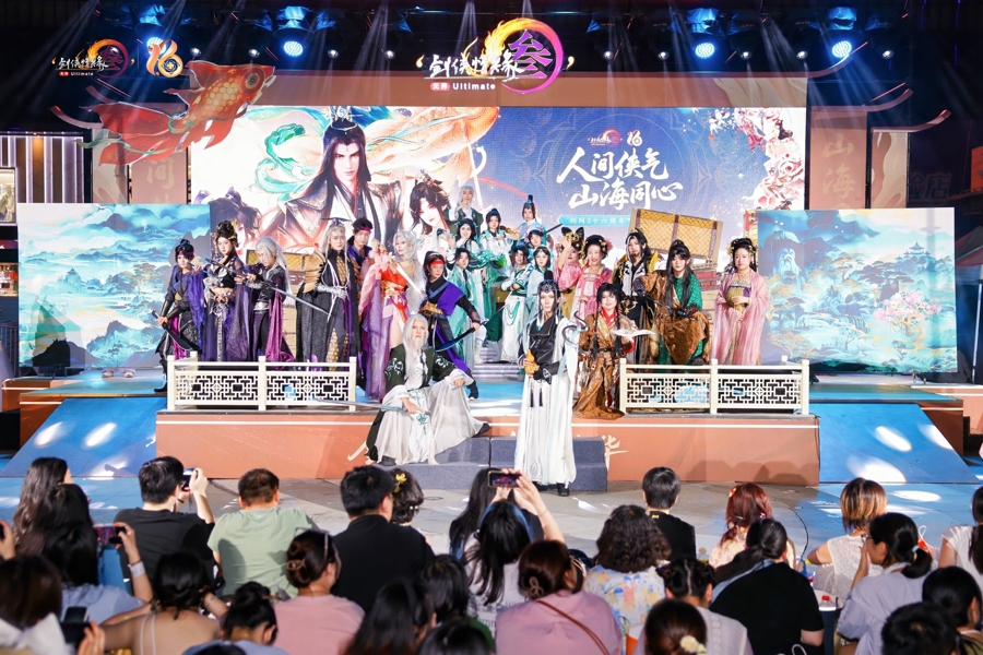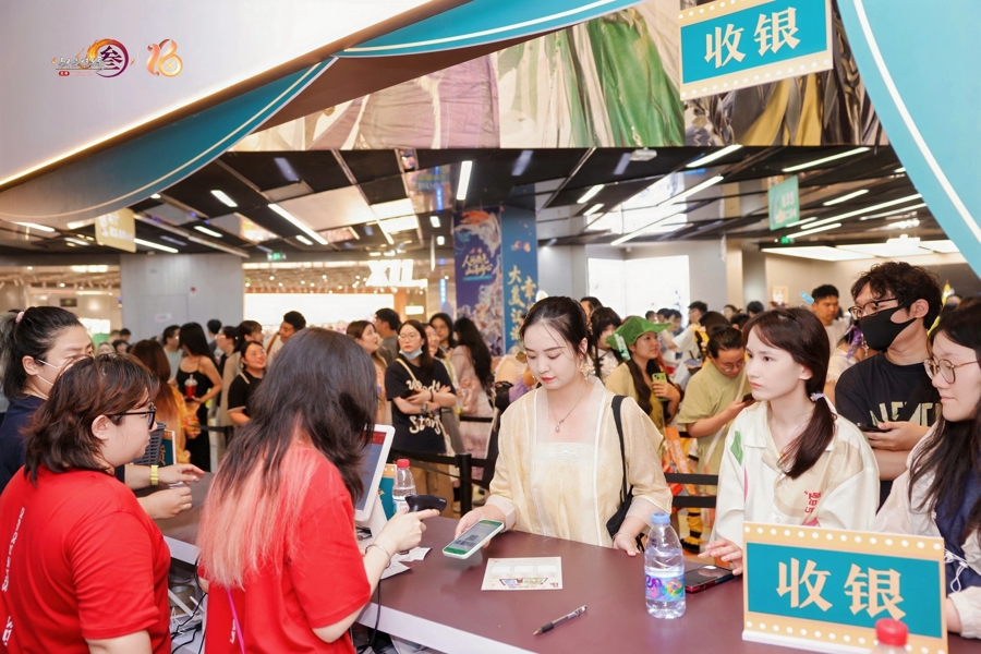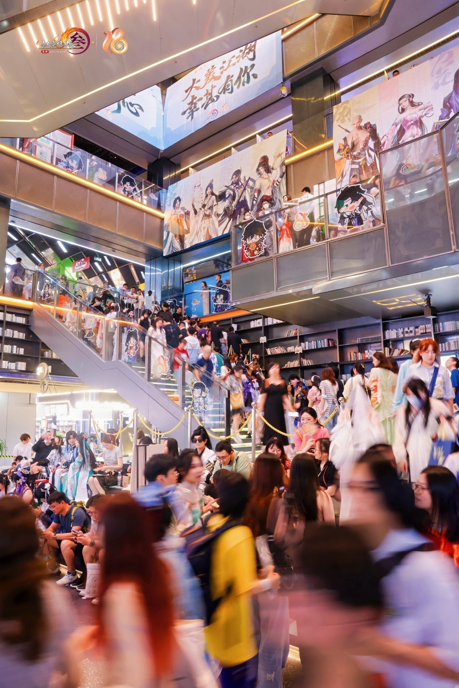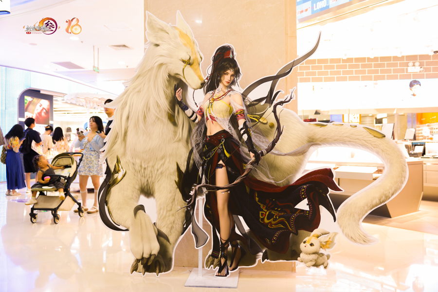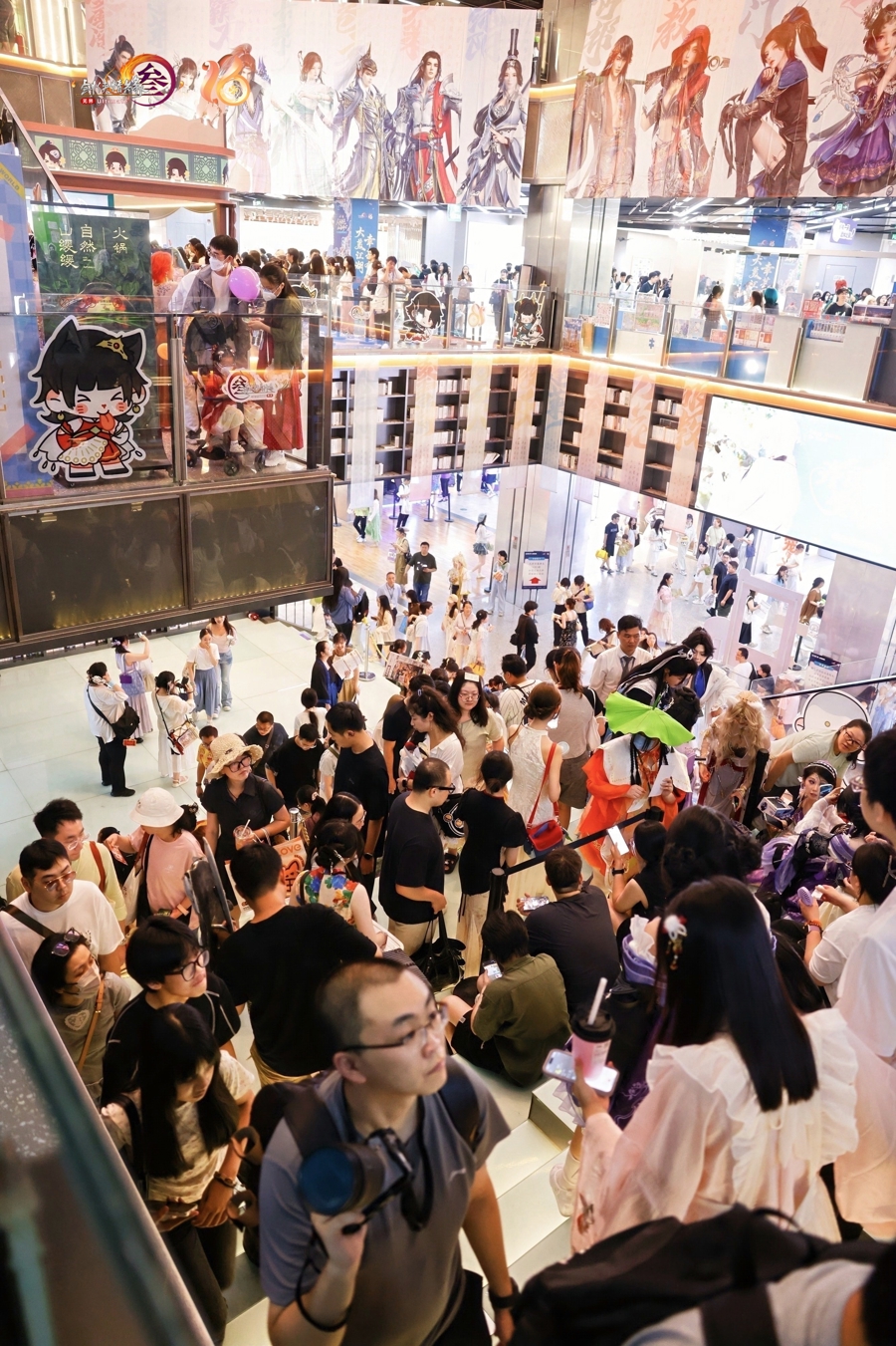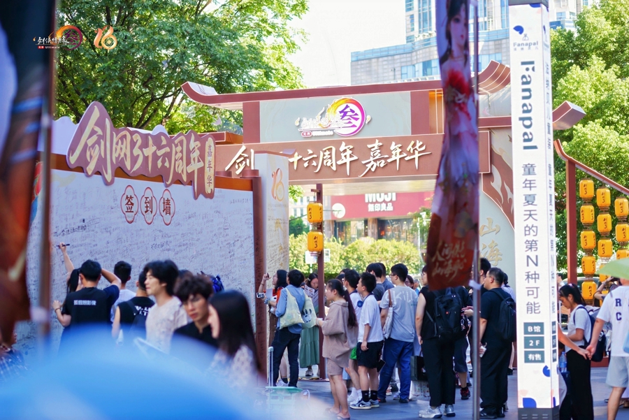 一走进上海五角场万达广场,二次元热浪扑面而来。七秀师姐、唐门师兄、纯阳弟子……无视30多摄氏度的高温,身穿COS服的玩家随处可见。8月28日至31日国际人登陆,《剑网3》十六周年主题游园会在此举行,万达广场的4栋楼被游戏中的门派形象、游戏元素全覆盖,俨然成为一个沉浸式的大唐武侠江湖。
