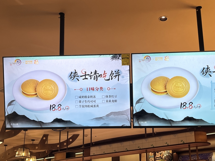 除了周边热销,商场内的餐饮店铺也迎来客流高峰。C栋的GOODSLOVECAFE和《剑网3》联动,推出了联名款餐饮。只见点餐台上方的屏幕上打出“侠士请吃饼”的字样,联动款松饼上,印上了《剑网3》热门的“黄鸡大笑”表情包。不仅如此,咖啡厅还辟出了一块空间,用于举办《剑网3》的玩家市集。记者采访时,一位摊主主动送来物料,是一张印有“黄鸡大笑”表情包的烫金贴纸,还有一张“五仙教老火锅”的抵用券。原来,五毒教在游戏中又被称为“五仙教”,五毒门派有一个技能叫“仙王蛊鼎”,该技能可以为玩家回蓝回血,因其效果强大,被玩家们调侃为“火锅”。“五仙教老火锅”也因此成为玩家们口中的一个梗。